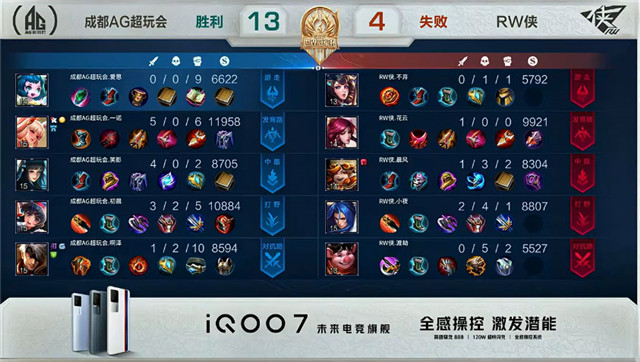 开局成都AG百里守约抢中。1分05秒RW侠主宰处击杀老夫子拿到一血。1分58秒成都AG对抗路击杀廉颇。2分26秒成都AG发育路击杀牛魔。3分08秒成都AG拿下暴君。3分24秒双方主宰处打野互换。4分39秒成都AG对抗路老夫子单杀廉颇。5分14秒RW侠对抗路击杀上官婉儿,成都AG摧毁敌方发育路外塔。5分55秒RW侠中路击杀裴擒虎。6分58秒中路团战成都AG打出0换2。7分15秒成都AG摧毁敌方中路外塔并击杀牛魔。7分44秒成都AG对抗路击杀虞姬。7分58秒成都AG拿下暴君。8分30秒野区双方1换1。9分整成都AG野区击杀露娜。9分21秒成都AG摧毁敌方中路二塔。9分32秒成都AG摧毁敌方发育路二塔。11分08秒成都AG摧毁敌方对抗路二塔。11粉4秒成都AG摧毁敌方中路高地塔。11分44秒高地团战成都AG击杀牛魔并摧毁敌方对抗路高地塔。12分20秒成都AG拿下暗影暴君。13分28秒成都AG发育路击杀牛魔。13分55秒高地团战RW侠打出1换2。16分26秒中路下河道团战RW侠打出1换2。17分35秒成都AG拿下暗影暴君。17分47秒高地团战成都AG打出0换5,上官婉儿拿到四连超凡。18分10秒成都AG摧毁敌方水晶拿下比赛。