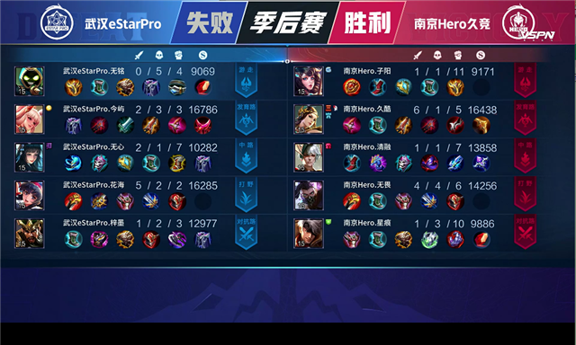 55秒,野区团,双方3换3,澜拿下双杀。1分34秒,武汉ES王昭君入侵野区单杀娜可露露随后被击杀。3分31秒,南京Hero猪八戒击杀王昭君。3分53秒,武汉ES拿下暴君。4分34秒,武汉ES破掉南京Hero下一塔。6分34秒,南京Hero反打击杀王昭君,随后破掉武汉ES中一塔。7分钟,南京Hero打出1换2。7分58秒,南京Hero击杀夏侯惇。9分03秒,武汉ES河道击杀鬼谷子。9分33秒,武汉ES拿下先知主宰,随后团战双方1换1。11分24秒,双方前排互换。11分50秒,南京Hero拿下暗影主宰。12分27秒,双方再次1换1。12分50秒,武汉ES击杀猪八戒。13分10秒,武汉ES拿下暗影暴君,但随后团战南京Hero打出0换3。11分45秒,南京Hero先后破掉武汉ES下、中高地。15分20秒,南京Hero先击杀王昭君,但下路团战武汉ES打出0换2。15分50秒,南京Hero娜可露露偷掉武汉ES上高地。16分13秒,武汉ES拿暗影主宰。17分38秒,武汉ES打出0换4。18分03秒,武汉ES从上路突破,强杀姜子牙后一波摧毁南京Hero水晶扳回一城。