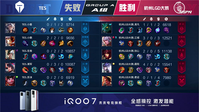 2分07秒,杭州LGD周瑜上路击杀鲁班七号拿下一血。2分15秒,杭州LGD拿下暴君。4分14秒,TES鲁班七号河道击杀墨子。6分42秒,杭州LGD百里守约中路击杀嬴政。7分12秒,杭州LGD破掉TES中一塔。9分03秒,TES鲁班七号二技能精准击杀残血吕布。10分10 秒,杭州LGD镜单杀娜可露露。10分35秒,杭州LGD破掉TES中二塔。11分07秒,杭州LGD拿下暗影主宰。11分23秒,杭州LGD百里守约下路单杀娜可露露。12分05秒,杭州LGD周瑜击杀猪八戒,随后破掉TES中高地。13分07秒,杭州LGD拿下暗影暴君。14分06秒,杭州LGD破掉TES上高地。15分30秒,杭州LGD拿下暗影主宰。16分10秒,杭州LGD下路反打打出0换4。16分38秒,杭州LGD镜追击击杀嬴政,随后杭州LGD四人摧毁TES水晶先下一城。