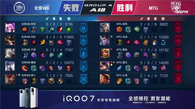 开局MTG入侵野区击杀沈梦溪拿到一血,1分10秒MTG拿下中路河道之灵。2分14秒MTG拿下暴君。3分27秒MTG中路反杀东皇太一。4分40秒下路团战MTG击杀东皇太一。5分32秒MTG拿下暴君,北京WB猪八戒与MTG赵云1换1,下路双方游走互换。6分35秒双方中路游走互换。7分01秒北京WB摧毁上路外塔。7分34秒北京WB下路打出0换2。9分17秒中路团战北京WB击杀盾山并摧毁敌方中路外塔。10分06秒上路团战双方2换2。11分04秒MTG下路击杀赵云。11分33秒MTG摧毁敌方中路外塔。12分46秒暴君处团战MTG打出2换4。13分28秒MTG摧毁敌方下路二塔。13分53秒MTG拿下暗影主宰。15分25秒野区团战双方1换1。16分35秒暴君处团战MTG打出2换5,周瑜拿到三连决胜,关羽拿到二连击破。17分04秒MTG摧毁敌方水晶拿下比赛。