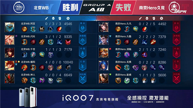 开局南京Hero选择野区入侵未果。1分11秒南京Hero拿下中路河道之灵。2分44秒中路团战南京Hero击杀嫦娥拿到一血。3分27秒北京WB中路击杀不知火舞。3分56秒南京Hero镜中路单杀嫦娥。6分27秒暴君处团战双方1换1。6分50秒南京Hero拿下暴君。6分57秒北京WB拿下主宰。8分13秒野区双方1换1。9分29秒北京WB摧毁敌方中路外塔。10分03秒北京WB下路击杀镜。10分37秒北京WB暴君处击杀牛魔并拿下暗影暴君。11分15秒北京WB上路击杀百里守约。11分43秒北京WB摧毁敌方中路二塔。12分27秒野区北京WB打出1换2。12分58秒北京WB拿下暗影主宰。14分30秒北京WB上路击杀不知火舞。14分54秒北京WB摧毁敌方上路高地塔。15分11秒北京WB摧毁敌方中路外塔。15分28秒北京WB拿下暗影暴君。16分23秒下路团战北京WB打出0换4。16分55秒北京WB摧毁敌方水晶拿下比赛。