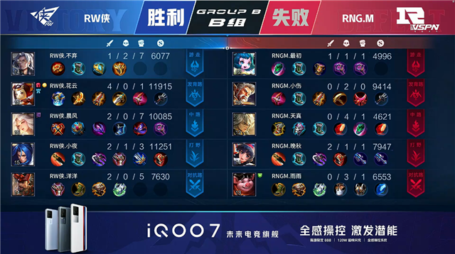 双方常规开局,1分04秒RW侠主宰处击杀姜子牙拿到一血。2分07秒RNG.M野区击杀周瑜。3分31秒RW侠野区击杀伽罗。4分05秒RW侠摧毁敌方下路外塔。4分39秒RW侠拿下暴君。5分28秒中路团战RW下打出1换2。7分06秒RNG.M主宰处击杀夏洛特。7分43秒RNG.M摧毁敌方上路外塔。7分52秒RNG.M摧毁敌方下路外塔。9分12秒RW侠拿下主宰。9分37秒RNG.M拿下暴君。10分27秒中路团战双方1换1。10分49秒RW侠拿下暗影暴君。11分53秒RW侠摧毁敌方上路二塔。12分06秒上路团战RW侠打出1换2。12分21秒RNG.M上路击杀周瑜。13分56秒暴君处团战RNG.M打出0换2。14分29秒RNG.M摧毁敌方中路二塔。14分39秒RNG.M摧毁敌方上路二塔。15分16秒RNG.M拿下暗影暴君。17分25秒RNG.M拿下暗影主宰。18分28秒RNG.M摧毁敌方下路高地塔。19分22秒RNG.M摧毁敌方中路高地塔。20分45秒RNG.M抢到风暴龙王,团战RNG.M打出3换5。21分27秒RNG.M摧毁敌方水晶拿下比赛。