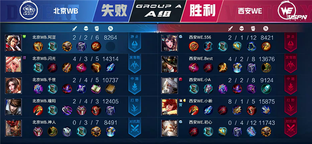 开局北京WB入侵野区,鬼谷子拿下一血,西安WE打出0换2。2分31秒澜拿下暴君,团战中鬼谷子被击杀。3分钟吕布反下蓝buff。5分20秒吕布在野区被击杀。6分19秒娜可露露拿下主宰,西安WE推掉下路一塔。6分50秒澜拿下暴君。8分30秒上路团战,鬼谷子被击杀。9分钟澜单杀娜可露露,同时团战西安WE打出0换2,蒙犽拿下双杀。西安WE顺势推掉中路一塔和二塔。10分26秒西安WE拿下暴君。10分33秒沈梦溪在野区被击杀,西安WE顺势推掉下路二塔。11分08秒西安WE强攻中路高地塔,双方打出1换1。12分50秒娜可露露拿下主宰,北京WB顺势推掉下路一塔。13分25秒蒙犽推掉上路二塔。15分钟河道团战,张良被击杀。15分30秒北京WB拿下暴君。16分15秒河道团战,北京WB打出1换2。17分20秒北京WB拿下主宰。19分20秒野区团战,西安WE打出0换2,澜拿下双杀。20分30秒澜拿下风暴龙王。21分40秒西安WE强攻上路高地塔,西安WE打出1换2。22分20秒西安WE推掉上路高地塔。22分36秒西安WE强攻中路高地塔,沈梦溪被击杀。23分50秒北京WB中路高地塔被破。24分10秒中路团战,北京WB打出1换3,虞姬拿下三杀。25分30秒北京WB拿下风暴龙王。26分11秒北京WB推掉中路一塔。26分58秒西安WE下路二塔被破。28分57秒北京WB下路高地塔被破。30分钟野区团战,双方打出1换1。32分钟河道团战,双方打出1换1。33分28秒野区团战,北京WB打出2换3。35分30秒河道团战,西安WE团灭北京WB,澜拿下四杀。36分11秒西安WE推掉水晶率先拿下一分。