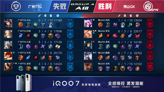 双方平稳开局。1分12秒佛山GK拿下中路河道之灵。2分20秒佛山GK拿下暴君。4分04秒佛山GK拿下主宰。6分17秒双方互换边路外塔。6分39秒双方上路1换1,佛山GK拿下一血。7分54秒中路团战广州TTG打出1换3,周瑜拿到三连决胜。8分17秒广州TTG摧毁敌方中路外塔。8分50秒佛山GK拿下主宰。9分01秒广州TTG拿下暴君。9分42秒广州TTG摧毁敌方下路二塔。11分02秒广州TTG拿下暴君。11分47秒广州TTG摧毁敌方中路二塔。12分41秒广州TTG摧毁敌方上路二塔。13分13秒广州TTG拿下暗影主宰。14分35秒中路团战广州TTG击杀牛魔。14分57秒广州TTG摧毁敌方上路、中路高地塔。15分42秒中路双方1换1。15分51秒佛山GK上路击杀马可波罗。16分30秒佛山GK拿下暗影暴君。17分36秒佛山GK拿下暗影主宰。19分54秒中路下河道团战双方1换1。20分49秒野区团战广州TTG打出0换4。21分14秒广州TTG摧毁敌方水晶拿下比赛。