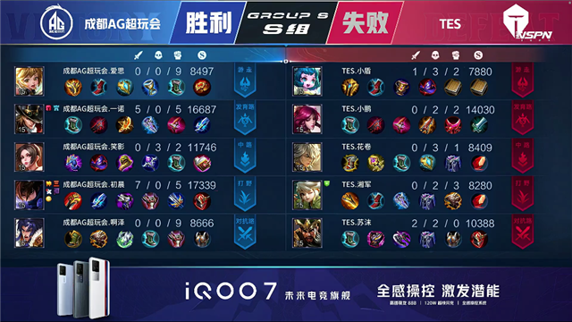 双方和平开局,2分23秒成都AG拿下第一条暴君,4分45秒成都AG拆掉TES下路一塔。5分59秒成都AG上路一塔被破,6分26秒成都AG拿下先知主宰,TES拿下暴君。7分钟中路团战TES打出2换3,拆掉成都AG中路一塔。8分30秒TES击杀成都AG橘右京,10分40秒中路团TES打出0换2,11分05秒TES拿下暗影暴君。12分20秒野区团成都AG击杀太乙真人,12分42秒成都AG拿下暗影主宰。13分16秒成都AG拆掉TES中路一塔,15分10秒野区团TES打出1换3,橘右京天秀击杀姜子牙后被镜击杀。17分钟TES拆掉成都AG上路二塔,17分21秒TES拿下暗影主宰,18分30秒成都AG牛魔被击杀。19分30秒成都AG三路二塔被破,20分34秒团战TES打出0换3,21分04秒TES拆掉成都AG下路高地,成都AG无力防守被一波拆掉水晶。