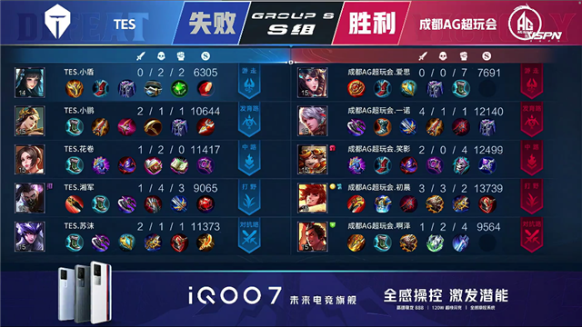 54秒成都AG廉颇击杀露娜拿下一血,双方1换1,2分20秒TES拿下第一条暴君。2分30秒下路团TES打出0换2,4分27秒成都AG拆掉TES下路一塔,4分40秒下路团TES打出1换2。5分15秒中路团双方1换1,7分07秒成都AG拿下暴君。8分05秒中路团TES拆掉成都AG中路一塔,成都AG击杀大乔,8分40秒上路团双方1换1。9分08秒成都AG下路二塔被拆,10分36秒TES拿下暗影暴君。11分10秒河道团双方1换1,13分20娜可露露、露娜互换,14分09秒成都AG廉颇被击杀。14分20秒TES拆掉成都AG下路高地打出1换2,强拆水晶拿下本局胜利。