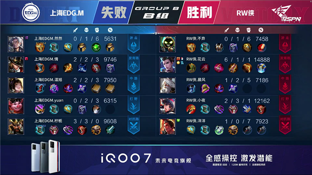 双方和平开局,1分31秒上海EDG.M娜可露露上路击杀白起拿下一血,2分11秒上海EDG.M拿下第一条暴君。3分09秒野区团上海EDG.M打出0换2,4分20秒RW侠拆掉上海EDG.M中路一塔,上海EDG.M反打0换3。6分05秒RW侠大乔被击杀,7分23秒上海EDG.M中路击杀周瑜。8分55秒中路团战上海EDG.M打出0换4,9分18秒上海EDG.M带领兵线拆掉RW侠下路高地,RW侠白起复活但无力防守,被一波拆掉水晶。
