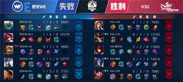双方平稳开局。2分19秒KSG拿下主宰。2分58秒中路河道处团战,西安WE打出1换2,镜拿下一血。4分40秒,双方互换边路一塔。5分钟中路下河道团战,冷轩被击杀。6分钟KSG拿下主宰,同时爆发团战,猪八戒被击杀。6分50秒KSG入侵红区,张飞被击杀。6分58秒中路团战,双方1换1。8分36秒,橘右京拿下暴君。10分37秒橘右京拿下主宰。11分35秒KSG击杀初心并推掉中路一塔。12分13秒,中路二塔处团战,KSG打出0换2。13分钟KSG推掉上路高地塔。14分22秒KSG强推高地打出1换2,并顺势推掉中路和下路高地塔。15分20秒,橘右京拿下主宰。16分20秒西安WE高地处团战KSG打出1换3。16分37秒KSG攻破水晶拿下本场比赛胜利。