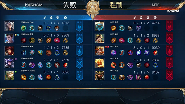 双方常规开局。1分06秒MTG拿下中路河道之灵。2分19秒上海RNG.M野区击杀关羽拿到一血。4分06秒MTG上路越塔击杀马超。4分15秒MTG摧毁敌方上路外塔。6分24秒MTG上路击杀马超。6分48秒MTG摧毁敌方下路外塔。7分18秒MTG拿下暴君。9分40秒上海RNG.M野区打出0换2。11分03秒上海RNG.M摧毁敌方中路外塔。12分32秒野区团战MTG打出0换4,沈梦溪拿到三连决胜。13分03秒MTG摧毁敌方上路高地塔。13分10秒MTG团灭对手摧毁水晶拿下比赛。