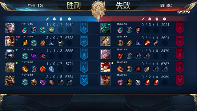 1分10秒,昆山SC百里守约击杀扁鹊拿下一血。2分25秒,昆山SC拿下暴君。4分10秒,广州TTG鲁班七号击杀墨子。6分31秒,广州TTG鲁班父子击杀百里守约。6分55秒,广州TTG拿下暴君。7分25秒,上路团,广州TTG打出0换3。8分钟,广州TTG破掉昆山SC上二塔。8分45秒,广州TTG团战打出0换3。9分10秒,广州TTG越高地击杀两人团灭对手,随后一波摧毁昆山SC水晶。