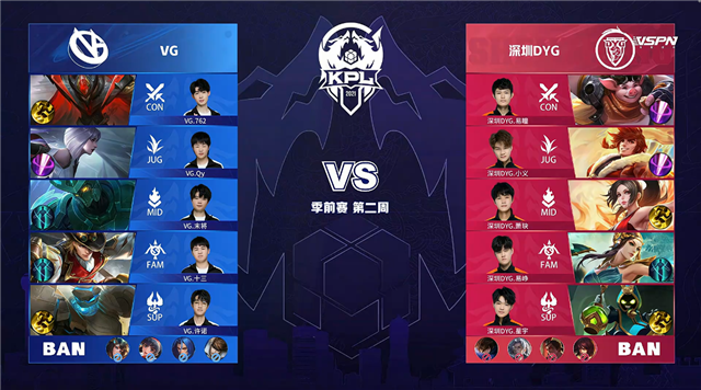 双方平稳开局,2分16秒深圳DYG拿下暴君。3分31秒深圳DYG摧毁敌方下路外塔。4分54秒主宰处团战VG击杀白起。5分58秒中路团战深圳DYG打出0换3。7分06秒野区团战深圳DYG击杀廉颇。7分40秒深圳DUYG拿下暴君。8分23秒深圳DYG摧毁敌方中路外塔。12分31秒深圳DYG拿下暗影暴君。13分04秒下路团战深圳DYG打出0换2。13分24秒深圳DYG摧毁敌方中路高地塔。13分38秒深圳DYG团灭对手摧毁水晶拿下比赛。