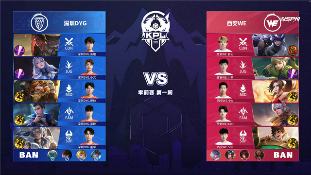 双方和平开局,3分46秒深圳DYG拿下第一条暴君,西安WE拿下先知主宰。4分33秒中路团深圳DYG鲁班大师击杀刘禅拿下一血,5分01秒深圳DYG拆掉西安WE下路一塔。6分钟上路团双方1换1,6分38秒西安WE不知火舞双杀,8分11秒西安WE拿下先知主宰。10分30秒暴君团西安WE打出0换4,11分10秒西安WE拿下暗影暴君。12分46秒深圳DYG击杀不知火舞,13分30秒上路团深圳DYG双方1换1,深圳DYG拆掉西安WE上路二塔。15分49秒深圳DYG拿下暗影暴君,16分25秒深圳DYG拆掉西安WE下路二塔。17分33秒西安WE拿下暗影主宰,20分钟下路团战深圳DYG打出0换3。20分41秒深圳DYG拆掉西安WE下路高地,22分钟团战深圳DYG打出2换4,狄仁杰拿到四杀。23分钟深圳DYG击杀不知火舞团灭西安WE,一波拆掉其水晶拿下胜利。