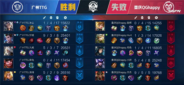 开局猪八戒入侵蓝区拿下蓝buff。2分11秒,小胖马超在中路拿下一血。2分47秒,广州TTG拿下暴君,上路重庆QGhappy杰杰蒙恬击杀九尾姜子牙。3分47秒中路上河道爆发团战,姜子牙被击杀。4分40秒下河道团战,孙膑被击杀。5分08秒,狄仁杰击杀西施并推掉下路一塔。6分37秒广州TTG入侵蓝区,小胖被击杀。7分27秒重庆QGhappy拿下主宰,广州TTG推掉中路一塔,双方河道团战,重庆QGhappy打出0换2。8分40秒,下路一塔处爆发团战,重庆QGhappy打出0换2。10分18秒上河道团战,清清被击杀,重庆QGhappy顺势拿下主宰。12分20秒重庆QGhappy强攻上路二塔打出1换2,蒙恬拿下双杀。13分30秒重庆QGhappy拿下暴君。14分40秒重庆QGhappy推掉上路高地塔。15分03秒重庆QGhappy拿下主宰。15分20秒下路二塔处团战,绑兔被击杀。16分58秒重庆QGhappy推掉下路高地塔。17分30秒,野区红buff旁爆发团战,广州TTG打出1换3。18分45秒广州TTG拿下暴君。19分54秒重庆QGhappy中路二塔处团战,广州TTG打出1换3。21分10秒广州TTG拿下风暴龙王。22分47秒,重庆QGhappy下路二塔被推掉。24分45秒上河道团战,蒙恬被击杀。26分钟广州TTG拿下风暴龙王。27分20秒广州TTG推掉上路高地塔。27分47秒广州TTG推掉下路高地塔,同时爆发团战,广州TTG打出2换3。30分30秒重庆QGhappy强开,双方打出1换1。32分40秒风暴龙王团,猪八戒拿下风暴龙王,广州TTG打出0换4。广州TTG顺势一波直推水晶,在33分17秒广州TTG赢得本局比赛胜利。