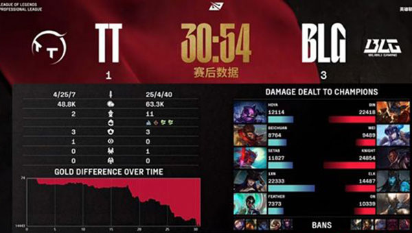 第四局,TT一级团入侵野区但是被BLG的拉扯+支援先ALL-IN女警之后反打一个0换4!TT直接前期爆炸了!knight卢锡安三杀之后再对位单杀SeTab永恩!4分钟对位都领先1200块了!中期BLG根本不给TT机会,各种换资源+推塔保住经济优势,TT一波下路绕后救队友结果被BLG团灭之后彻底没了希望!BLG稳步推进拿下渴血厄塔汗+大龙之后结束比赛,淘汰TT,进入了败者组第三轮!本局MVP为knight!