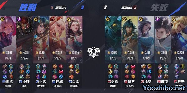 第三局,七分钟KLG五打四反红失败被团灭,未能第一时间处理鲁班七号,节奏断档。DYG迅速推塔滚雪球,十三分钟夏洛特完美开团,鲁班持续输出收割,DYG稳扎稳打,成功拿下本局胜利!本局MVP为深圳DYG丶栋栋 (王栋)夏洛特!