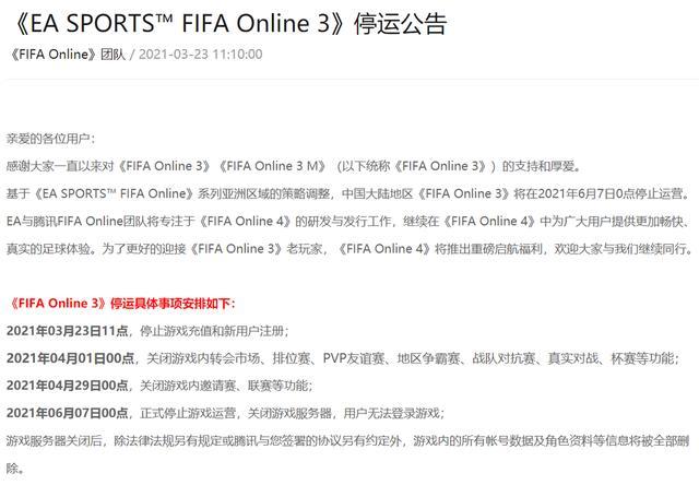 JRS直播网3月23日讯FIFA Online 3官网今日发布了停运公告,游戏将在今年6月7日0点正式停止运营,关闭服务器。