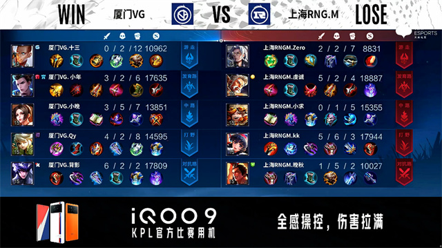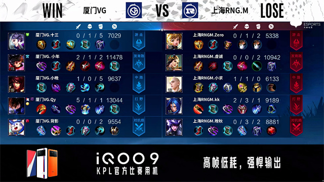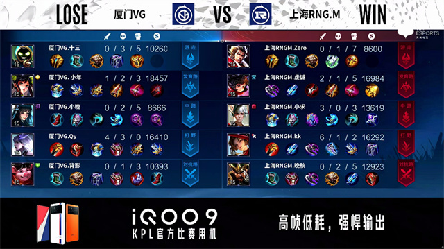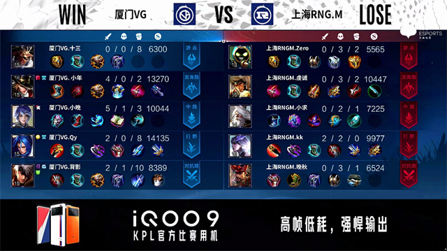 2分15秒,上海RNG.M控下暴君。3分19秒,厦门VG澜击杀橘右京拿下一血。3分44秒,厦门VG控下先知主宰。4分40秒,厦门VG破掉上海RNG.M下一塔。5分04秒,厦门VG上路击杀橘右京。5分43秒,厦门VG破掉上海RNG.M上一塔。6分18秒,厦门VG上路击杀橘右京并破掉上海RNG.M上二塔。6分45秒,厦门VG李元芳击杀马超,随后控下暴君。8分35秒,厦门VG控下先知主宰,随后破掉上海RNG.M中一塔。9分20秒,双方团战1换1。9分50秒,双方团战2换2,厦门VG主宰先锋破掉上海RNG.M下二塔。10分41秒,厦门VG控下暗影主宰。11分45秒,厦门VG破掉上海RNG.M下高地。12分38秒,厦门VG控下暗影暴君。13分26秒,厦门VG破掉上海RNG.M中二塔。14分25秒,厦门VG控下暗影主宰,随后破掉上海RNG.M上二塔。14分50秒,厦门VG破掉上海RNG.M中高地。15分13秒,厦门VG边团边拆摧毁上海RNG.M水晶赢下比赛。