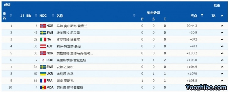 最终,中国选手唐佳琳、孟繁棋、褚源蒙、丁雨欢分列第35、62、61、76位;挪威选手雷塞兰以20:44.3的成绩摘金,瑞典选手厄贝里获得银牌,意大利选手维雷尔获得铜牌。