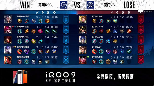 1分36秒,苏州KSG周瑜击杀暃拿下一血。3分03秒,苏州KSG拿下暴君。4分38秒,苏州KSG破掉厦门VG下一塔。5分30秒,厦门VG控下先知主宰。7分18秒,苏州KSG破掉厦门VG中一塔。7分58秒,苏州KSG控下暴君。8分57秒,苏州KSG团战打出0换2,随后破掉厦门VG中二塔。9分15秒,苏州KSG击杀孙膑,随后破掉厦门VG上高地。10分16秒,苏州KSG控下暗影主宰。10分55秒,苏州KSG破掉厦门VG下二塔。11分16秒,苏州KSG团战打出0换2并破掉厦门VG中、下高地,随后一波摧毁厦门VG水晶率先拿到赛点。