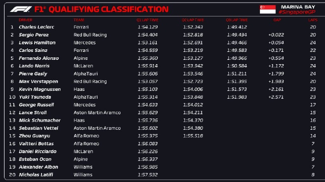 JRS直播网讯 2022年F1新加坡大奖赛排位赛在滨海湾赛道结束。Q3竞争非常激烈,最快圈速多次被刷新!最终,法拉利车队勒克莱尔继2019年后,再次拿到新加坡大奖赛的杆位!红牛车队佩雷兹第二,梅赛德斯车队汉密尔顿第三!维斯塔潘第八,中国车手周冠宇第15。