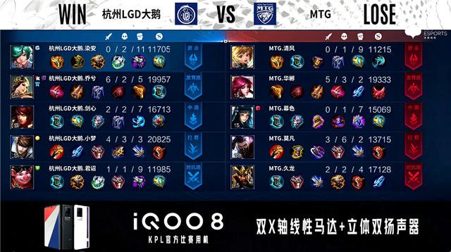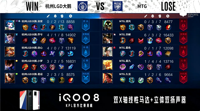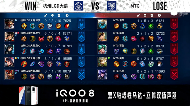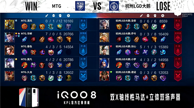 双方常规开局。1分48秒MTG对抗路击杀夏侯惇拿到一血。2分29秒杭州LGD大鹅拿下暴君,团战杭州LGD大鹅打出2换4。4分整MTG主宰处击杀蔡文姬。4分40秒杭州LGD大鹅野区打出0换2。6分48秒杭州LGD大鹅野区击杀盘古。7分06秒杭州LGD打色拿下暴君。7分15秒杭州LGD大鹅摧毁敌方中路外塔。9分13秒杭州LGD大鹅摧毁敌方中路二塔。10分25秒杭州LGD大鹅拿下暗影暴君。13分31秒杭州LGD大鹅发育路击杀太乙真人并摧毁发育路高地塔。15分14秒杭州LGD大鹅拿下暗影暴君。16分08秒杭州LGD大鹅摧毁敌方对抗路高地塔。17分16秒杭州LGD大鹅拿下暗影主宰。17分45秒中路团战MTG打出1换3。20分06秒发育路团战杭州LGD大鹅打出1换2。20分49秒杭州LGD大鹅团灭对手摧毁水晶拿下比赛。