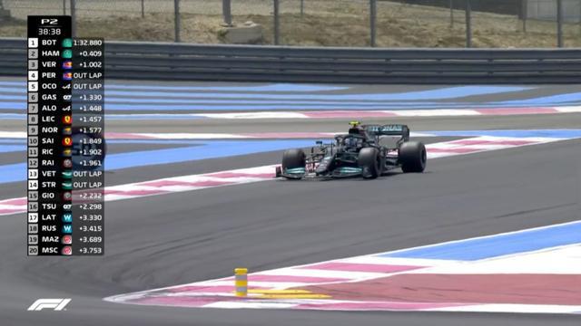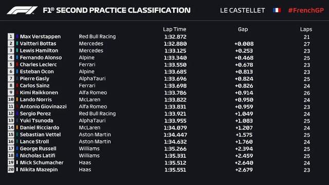 最终,二练结束,维斯塔潘1:32.872仍旧排名第一,博塔斯第二仅慢了0.008秒,汉密尔顿第三,Alpine车队的阿隆索第四;勒克莱尔、奥康、加斯利、塞恩斯、莱科宁、诺里斯分列五至十位。值得留意的是,博塔斯的成绩是使用中性胎做出的。主场作战的Alpine车队表现不俗,两位车手分别排在第四和第六位。