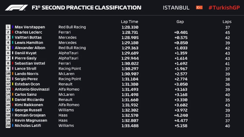 F1土耳其大奖赛第二次练习赛成绩表: