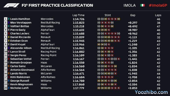2020F1意大利伊莫拉站练习赛成绩表: