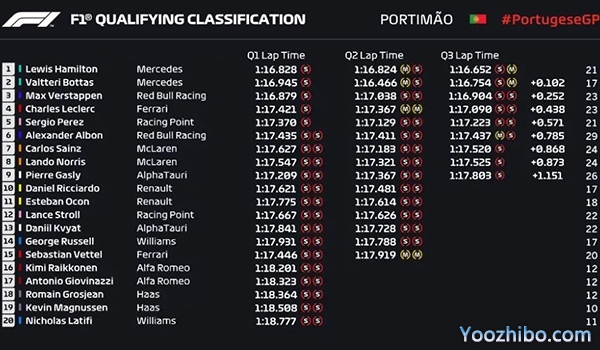 三轮排位赛中,汉密尔顿在第一轮第一个计时圈发挥不佳,但随后及时调整状态,最终以1分16秒828帮助梅赛德斯车队暂时登顶。第二轮排位赛中,博塔斯以1分16秒466位居第一,汉密尔顿以0.358的劣势排名第二。第三轮排位赛中,凭借最后时刻跑出的1分16秒652的成绩,汉密尔顿绝杀队友博塔斯夺得杆位,维斯塔潘位列第三。