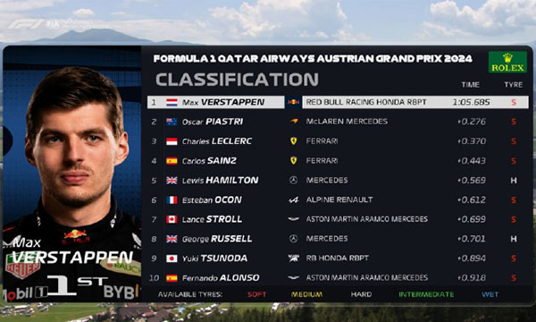 JRS直播网讯 北京时间06月28日晚,2024F1奥地利大奖赛, 一练最终成绩: