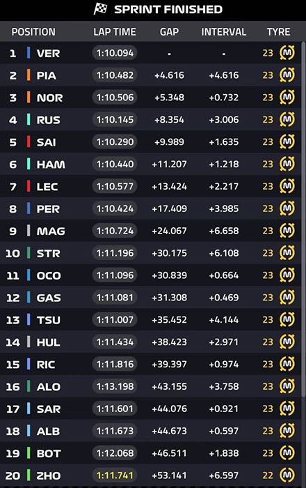JRS直播网讯 北京时间06月29日,F1奥地利站冲刺赛结束争夺,维斯塔潘夺冠,迈凯伦包揽2、3名,周冠宇垫底。