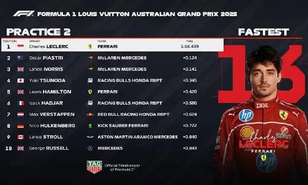澳大利亚大奖赛第二次练习赛,勒克莱尔以1:16.439排名第一,皮亚斯特里落后0.124秒排名第二,诺里斯落后0.141秒排名第三,角田裕毅和汉密尔顿分列四五。