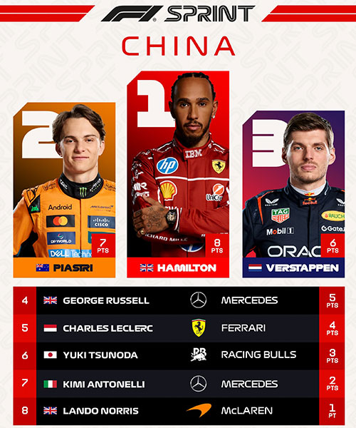 JRS直播网讯 北京时间3月22日,2025赛季F1中国大奖赛今日进行了冲刺赛的争夺。杆位发车的汉密尔顿夺得冠军,皮亚斯特里超越维斯塔潘获得第二名,维斯塔潘第三,诺里斯仅获得第八名。