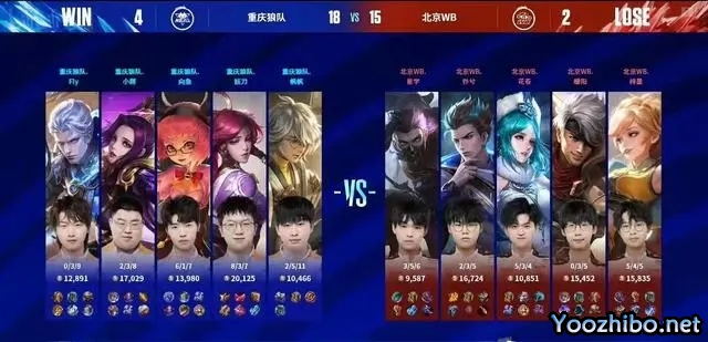 第四局,重庆狼队蓝色方,拿到了赵怀真+老夫子,辅助大乔。北京WB红色方,拿到了娜可露露+李元芳。开局重庆狼队击杀李元芳,拿下一血。6分钟,重庆狼队五人组迅速反包,一波零换四,直推中路一塔。9分钟,重庆狼队经济差拉开五千。12分钟,重庆狼队直推下路高地。决胜团,重庆狼队直推水晶,扳平比分。