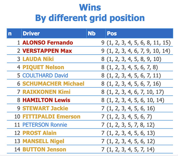 维斯塔潘已经从9个不同的位置起步夺冠,追平了阿隆索保持了10年的纪录