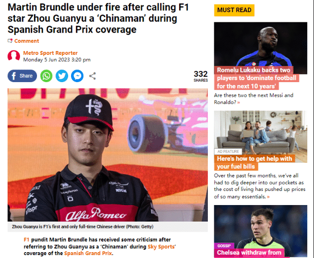 事情的起因是F1西班牙站大奖赛期间,天空体育F1知名解说马丁-布伦德尔在直播中谈到周冠宇的时候使用的是“Chinaman”(中国佬)这一极具侮辱和歧视性的词语。在直播自动生成字幕中,这一词语被自动过滤,很显然所有人都知道在,这是不能说的词语。