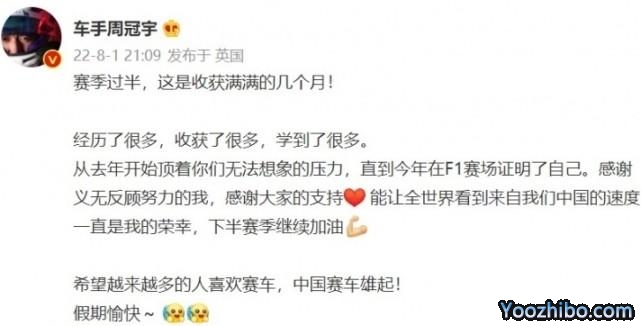 并附文动情写道:“这几个月自己收获满满,经历了很多,收获了很多,学到了很多。从去年开始顶着你们无法想象的压力,直到今年在F1赛场证明了自己。感谢义无反顾努力的我,感谢大家的支持!能让全世界看到来自我们中国的速度一直是我的荣幸,下半赛季继续加油!希望越来越多的人喜欢赛车,中国赛车雄起!假期愉快!”