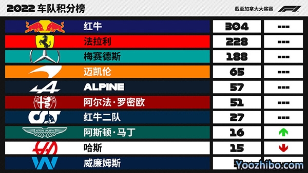 | 2022车队积分榜(截至奥地利大奖赛) | ||