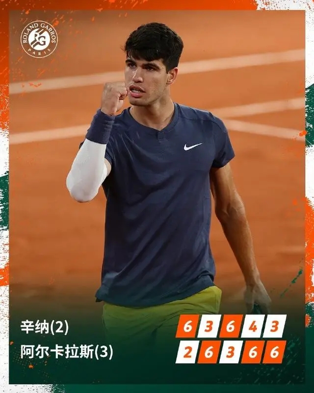 JRS直播网讯 6月8日讯 在刚刚结束的法网男单半决赛中,阿尔卡拉斯和辛纳上演五盘大战,最终阿尔卡拉斯凭借着决胜盘盘初的破发,3比2击败辛纳,晋级法网男单决赛。