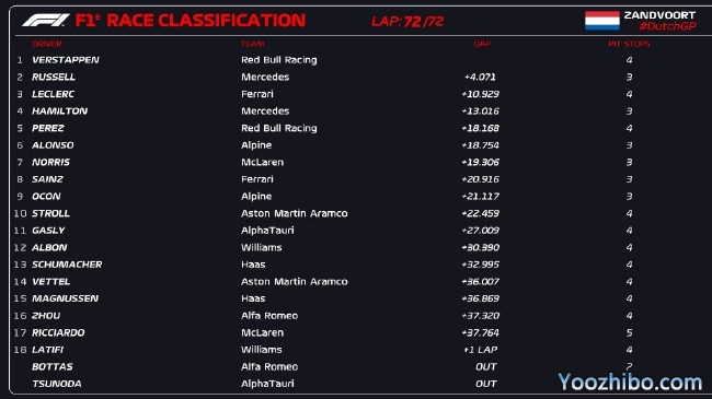 JRS直播网讯 2022年F1荷兰大奖赛正赛一波三折,最终红牛车队维斯塔潘在最后一次安全车结束后超越汉密尔顿,成功在主场拿到冠军!完成了在赞德沃特主场的两连冠。梅赛德斯车队拉塞尔收获亚军,法拉利车队勒克莱尔拿到季军!