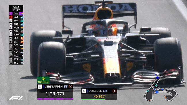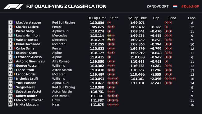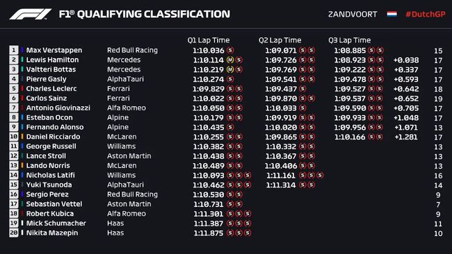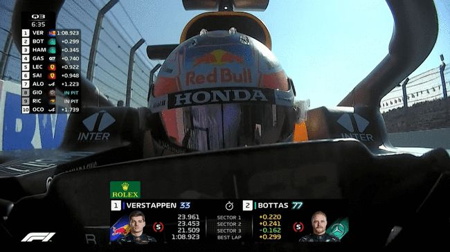最终Q3结束,维斯塔潘以1:08.885的成绩保持领先,汉密尔顿在最后时刻超越自己的队友上到第二,落后0.038秒,博塔斯第三,落后0.337秒;加斯利和勒克莱尔排在第四和第五;第六至第十的车手分别是:塞恩斯、吉奥维纳兹、奥康、阿隆索、里卡多。