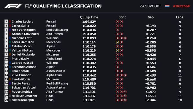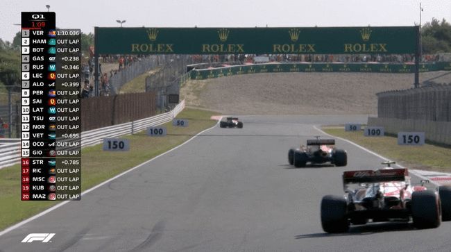 第一个计时圈结束,目前维斯塔潘以1:08.923的成绩排名第一,领先第二的博塔斯0.299秒;汉密尔顿排名第三落后0.345秒;加斯利和勒克莱尔分列第四第五。车手们回到维修区,准备进行最后的争夺。