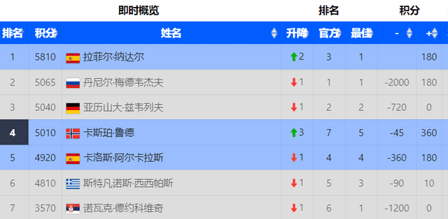 目前,在即时世界排名积分上,纳达尔以5810分已经登上了第一的位置,梅德韦杰夫5065分暂时排名第二,但他已经失去了继续涨分的机会。小兹维列夫5040分排名第三,但他因伤没有参加美网,也无缘争夺世界第一。晋级8强的鲁德,目前积分5010分排名第四。西班牙少年阿尔拉卡斯以4920分排名第五。西西帕斯提前出局,他也失去了争夺机会。