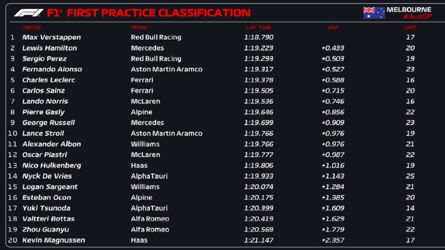 JRS直播网讯 北京时间03月31日,2023年F1澳大利亚大奖赛第1次练习赛在墨尔本赛道结束,红牛车队维斯塔潘凭借1:18.790的成绩取得头名,梅赛德斯车队汉密尔顿落后0.433秒第二,另一位红牛车手佩雷兹第三,他的最快圈是用中性胎做出的。