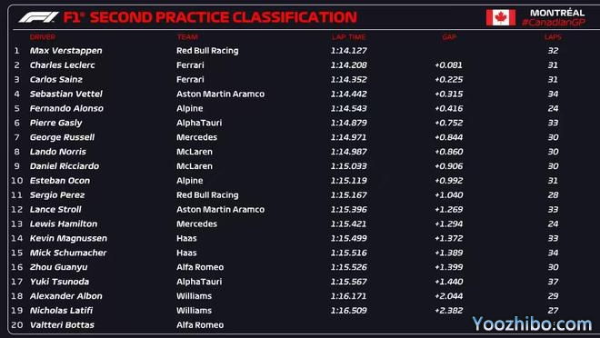 JRS直播网讯 加拿大站二练,红牛车手马克斯·维斯塔潘以1分14秒127的成绩排名第一,勒克莱尔落后0.081秒位居第二,赛恩斯第三,维特尔第四,另外前十名的车手还有:阿隆索、加斯利、拉塞尔、诺里斯、里卡多、奥康。