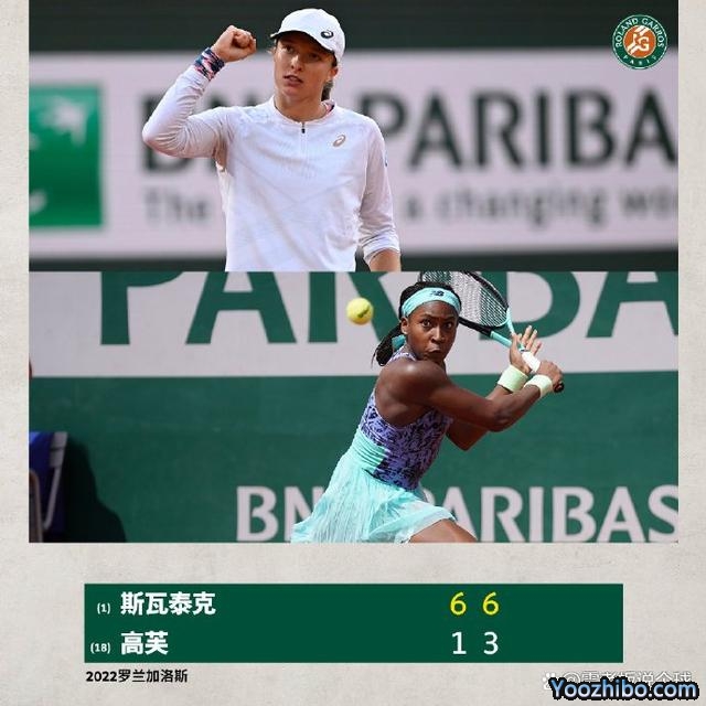 首盘比赛由高芙率先发球,她一上来就显得十分紧张,一次正手失误送出发球局,斯瓦泰克抓住高芙精神紧张、脚下动力不足的机会顶住压力保发,建立起2-0的领先优势。第3局高芙的非受迫性失误依旧居高不下,斯瓦泰克兑现所拿到的第5个破发点实现破发,轻松保发之后将比分优势带到了4-0。第5局高芙顶住平分压力,依靠一个发球直接得分终于保发避免了吞蛋的尴尬,但是斯瓦泰克还是在第7局兑现第2个破发点再度破发得手,6-1先下一盘。