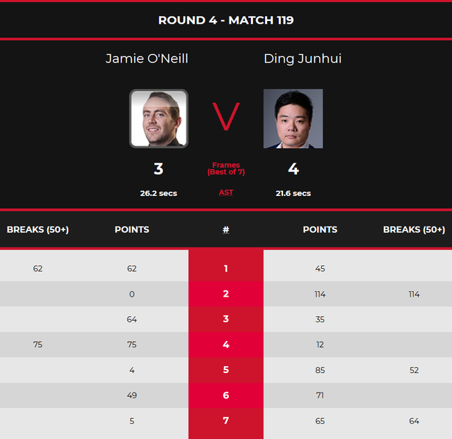 第四局,在丁俊晖率先上手拿下12分后,奥尼尔再次抓住机会,打出单杆75分一杆制胜,以75-12再下一城,大比分3-1拿到赛点。