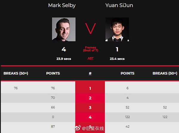 四局,袁思俊率先上手,打出了单杆122分完成零封,1-3追回一局。第五局,开局一番防守后,塞尔比入局,53-0后中断转入防守。袁思俊单杆42分进入防守。袁思俊漏底库红球,塞尔比再上手扩大优势,顺利赢下,大分4-1轻松淘汰了袁思俊。超分拿下这局总分4-1获胜晋级第二轮。