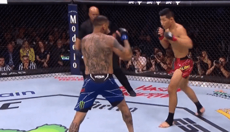 第一回合,李景亮用招牌的虚晃影响对手,双方身材的差距还是肉眼可见的。罗德里格兹冲拳有点猛,李景亮踉跄了一下,但站稳了没有问题。双方处于站立的对峙,相对比较谨慎。李景亮突然一记前直冲拳,接一个扫踢。罗德里格兹跟上一记摆拳击中李景亮。李景亮扫腿直接扫倒了对手成功,第一回合结束,罗德里格兹的嘴部有出血。
