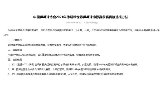 来源:JRS直播网09-09 19:49JRS直播网9月09日讯 下午,中国乒乓球协会公布了世乒赛的参赛资格选拔办法,奥运会之后,国际大赛最重要的就是世乒赛了,在9月份的全运会结束之后是10月份的乒超联赛,世乒赛则是在11月23日至29日在美国休斯顿举行,如今参赛运动员选拔规则已经出炉。